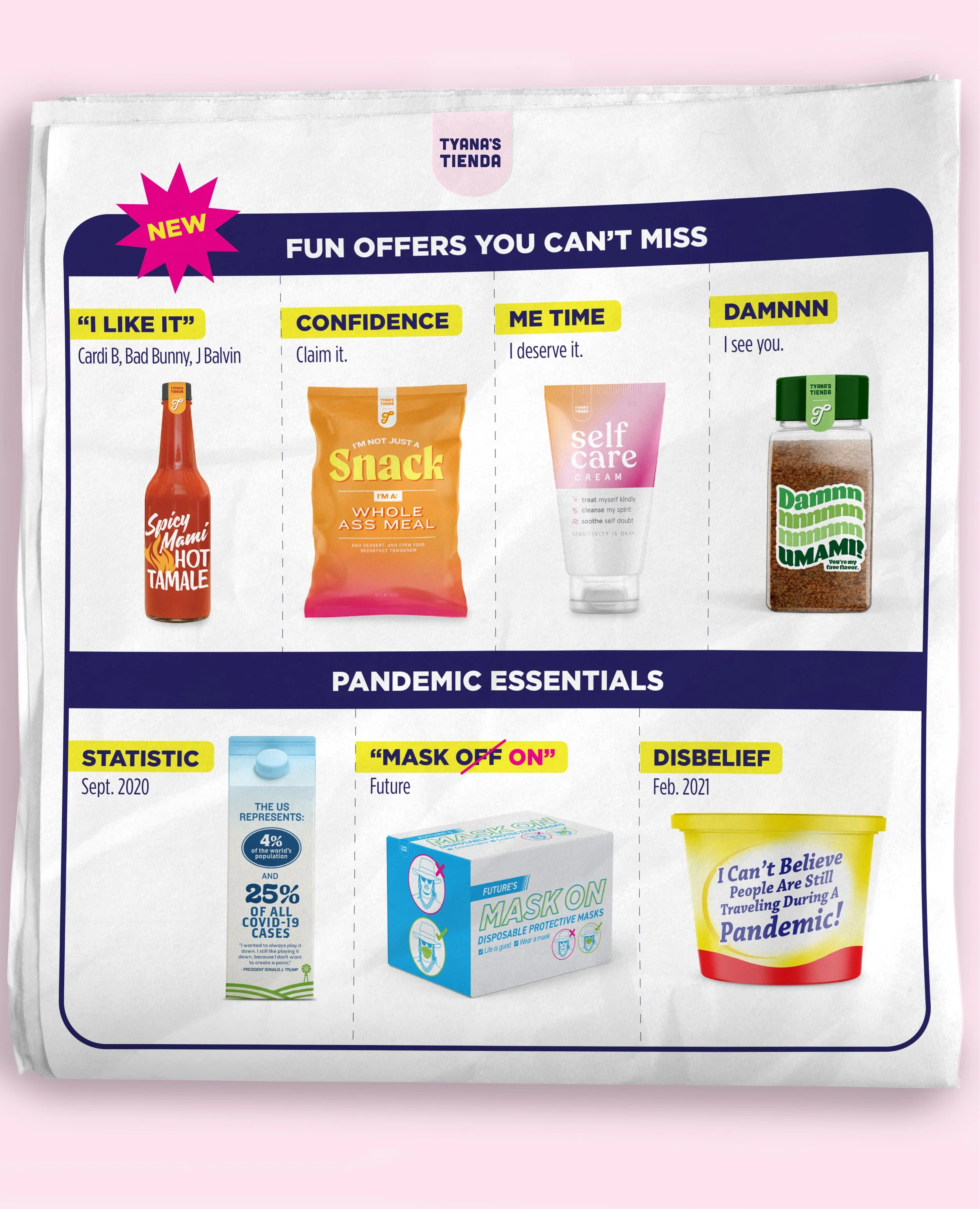 Tyana’s Tienda is a personal project that is powered by artivism, joy, storytelling and self expression. It aims to be a store that uses the packaging and branding that we are familiar with to create impact in the world.